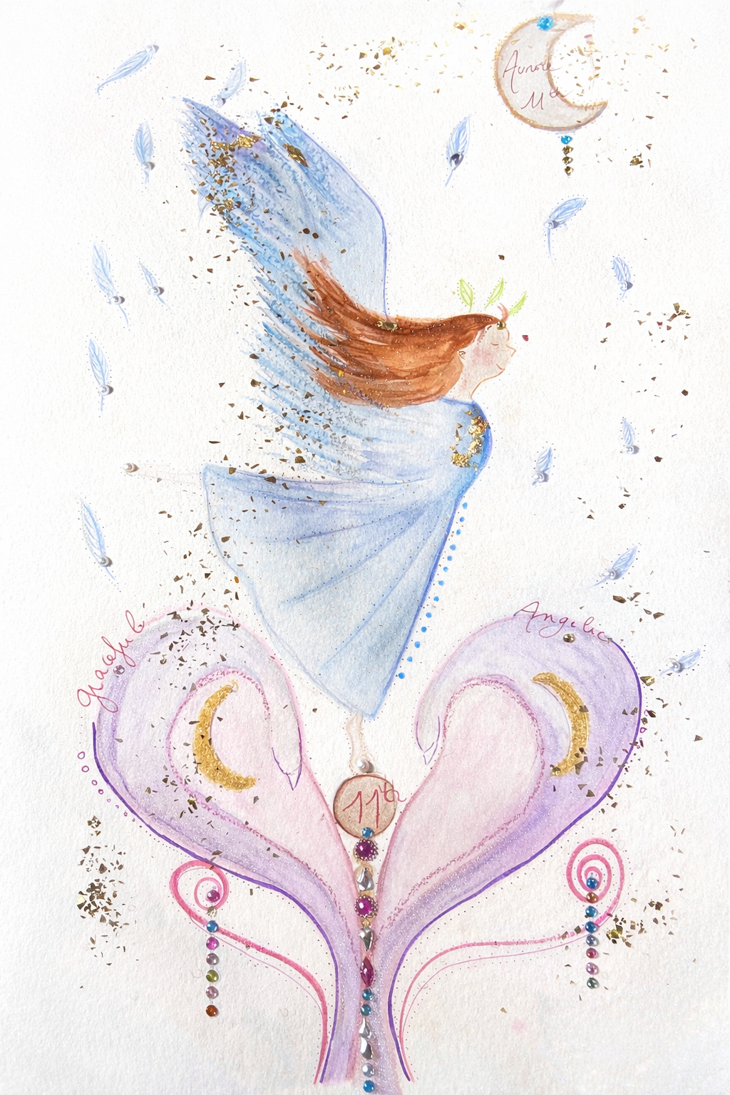 Painted in watercolor, the creation unfolds in transparency and softness. Colors blend like a gentle breath, offering a calming and luminous presence — ideal for wrapping their room in benevolent, protective energy.